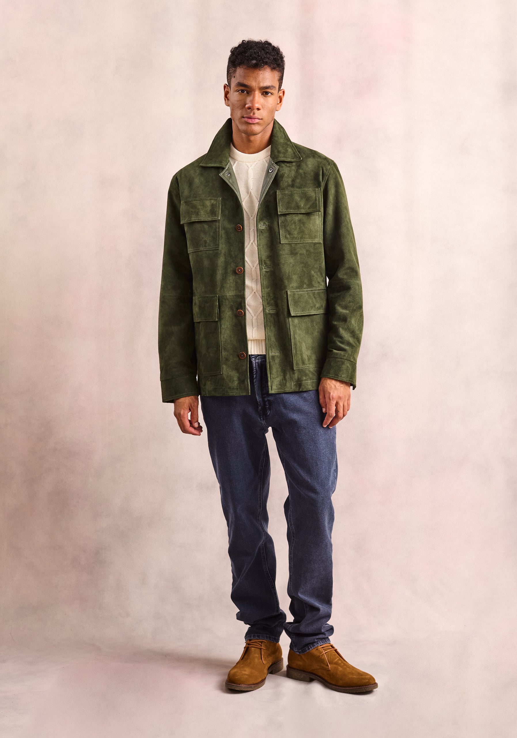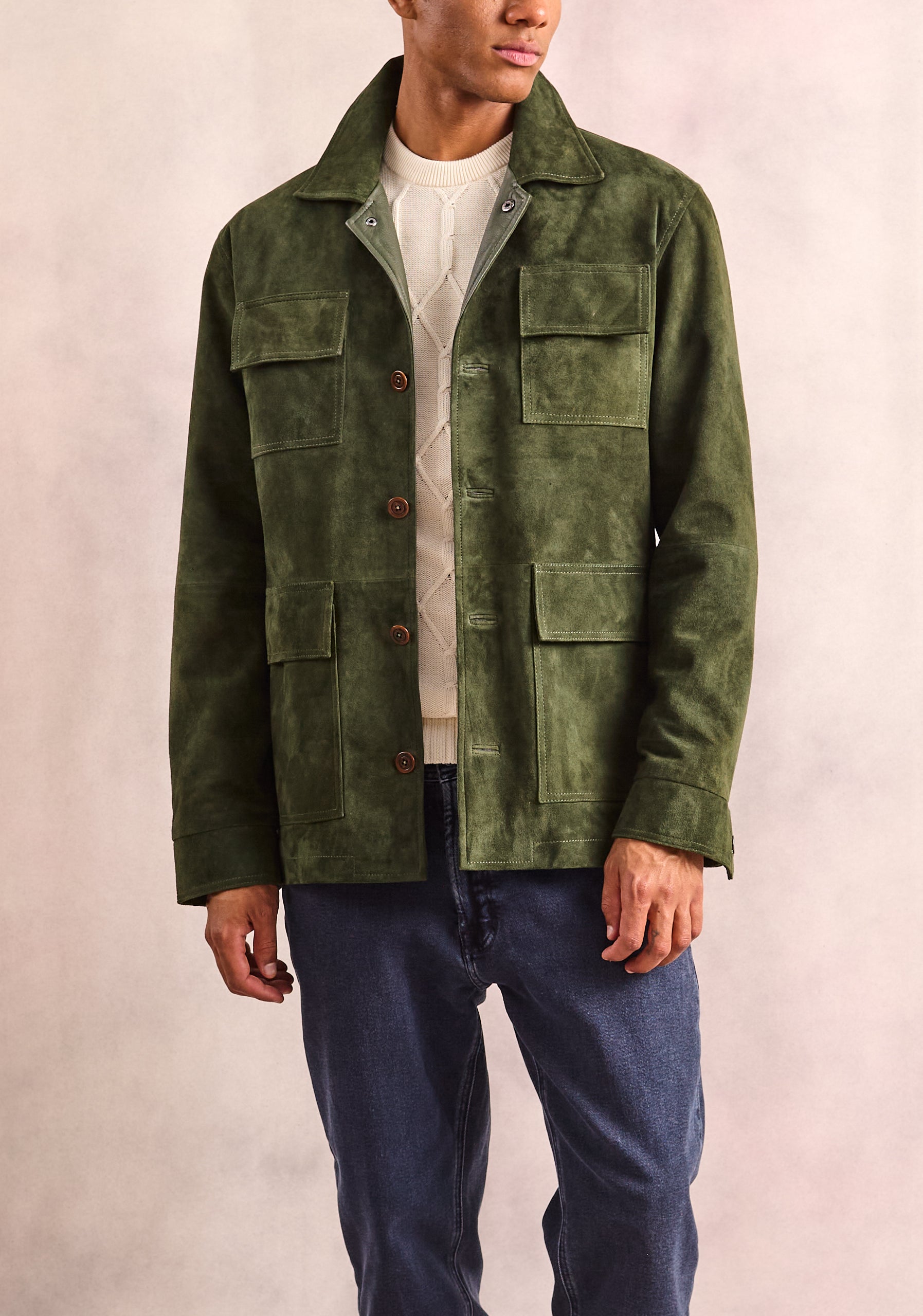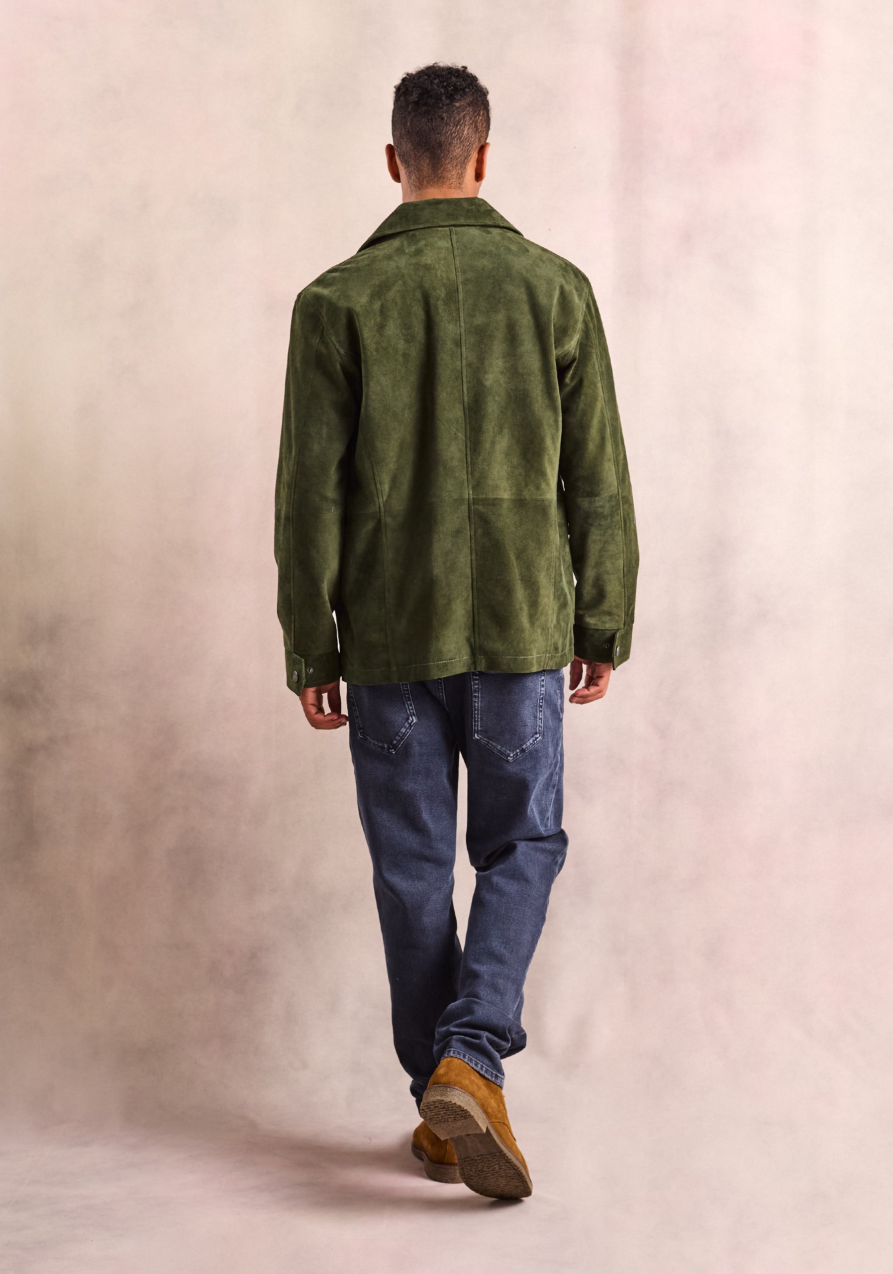 Esta chaqueta diseña en gamuza es una pieza clave para el hombre moderno que busca un balance entre sofisticación y funcionalidad. Su color verde profundo aporta carácter y versatilidad, mientras que los detalles de diseño cuidadosamente pensados elevan cualquier outfit.