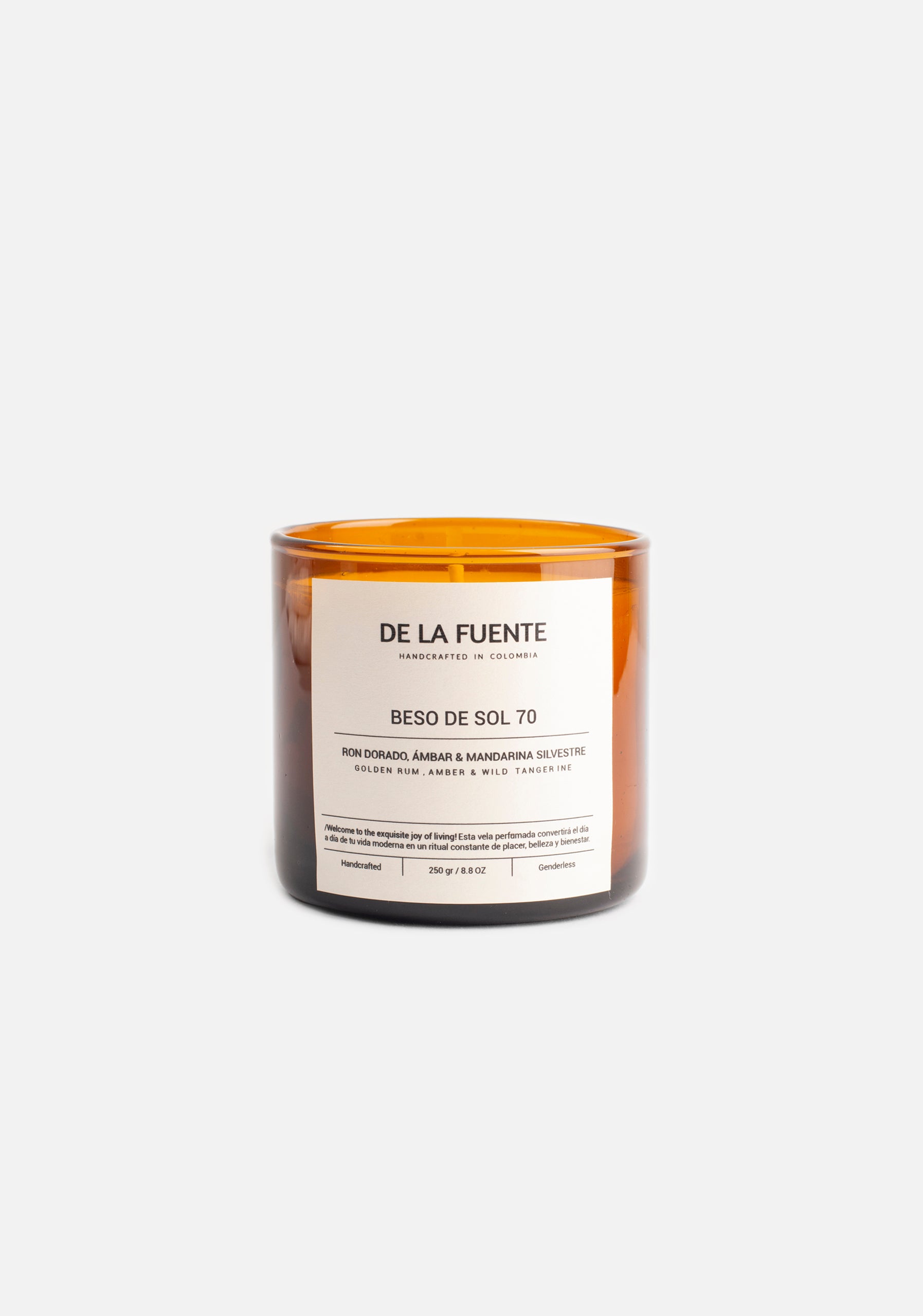 Beso de Sol es una vela artesanal de carácter cítrico y amaderado, creada para evocar la luz cálida y la serenidad de un instante perfecto. Su fragancia se abre con notas frescas y luminosas de mandarina silvestre, que dan paso a la suavidad envolvente del ron dorado, y culminan en la profundidad elegante y reconfortante del ámbar. Una composición tipo cóctel que invita a habitar el presente y reconectar con lo esencial.